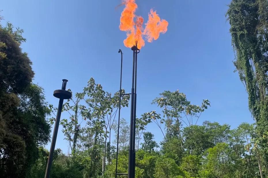 A methane flare near Joya de Los Sachas in the Ecuadorian Amazon. If the historic referendum of August, 2023, is respected, the oil industry must cease its operations and remove infrastructure from the ITT block within a year.